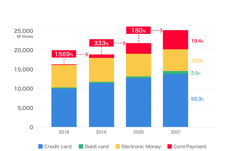 As the promotion of cashless payments has become a global trend in recent years, the public and private sectors in Japan have joined forces to promote cashless payment measures. The Ministry of Economy, Trade and Industry (METI) has announced that cashless payments in Japan in 2022 accounted for 36.0% of all payments, or 111 trillion yen, indicating a good trajectory towards the target of 40% in 2025. In 2021, the number of code payment (both QR code and barcode) transactions exceeded 4.8 billion, an increase of 180% from the previous year. This rate of growth stands out among the various cashless payment methods and services, indicating that code payments are becoming more ubiquitous in daily life.