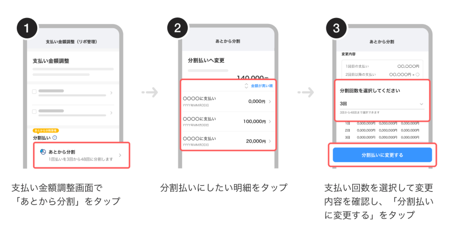 「あとから分割」は、一度決済した利用分を、後から分割払いに変更できる機能です。