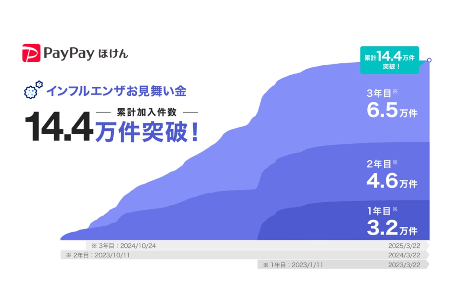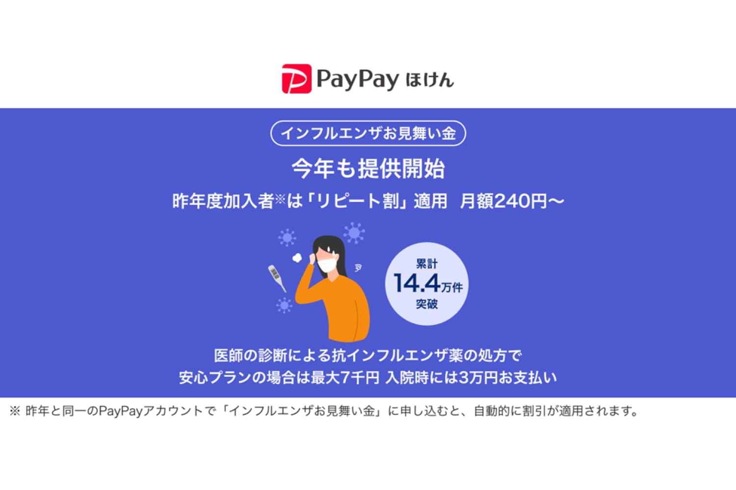 LINEヤフー株式会社(以下、LINEヤフー)のグループ会社である、PayPay保険サービス株式会社(以下、PayPay保険サービス)とPayPay株式会社(以下、PayPay)は、キャッシュレス決済サービス「PayPay」内の「PayPayほけん」ミニアプリ(※1)で「インフルエンザお見舞い金(以下、本保険)」の提供を本日より再開します。本保険は、インフルエンザに特化した国内初(※2)の保険商品として2023年1月から提供を開始し、多くのユーザーに好評いただいており、累計加入件数は14.4万件を突破しています。