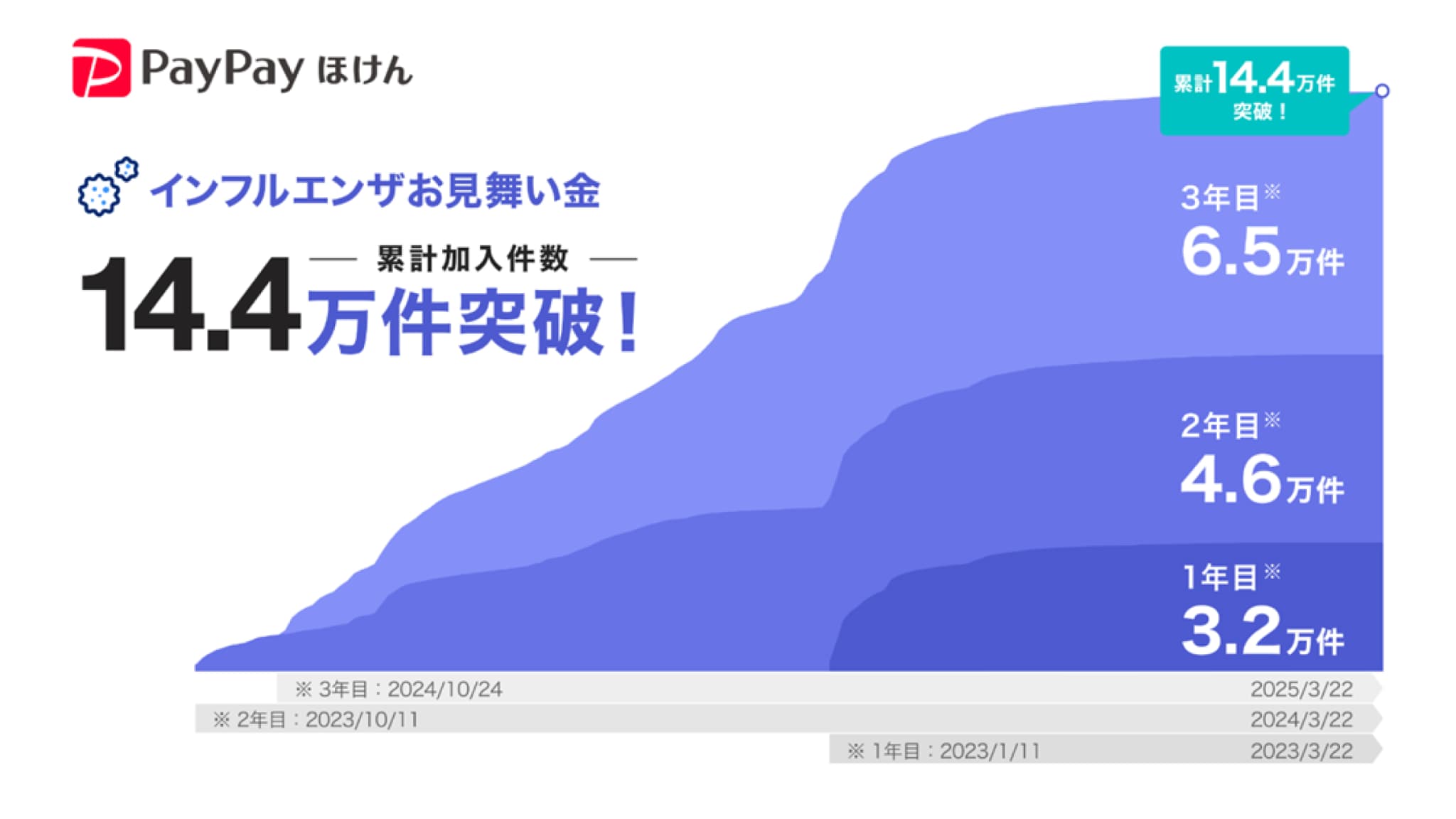 本保険は、インフルエンザに特化した国内初の保険商品として多くのユーザーに認知いただき、3年目の提供となる2024年10月からの販売では約6か月間で6.5万件の申し込みをいただきました。また、累計加入件数は14.4万件を突破しています。