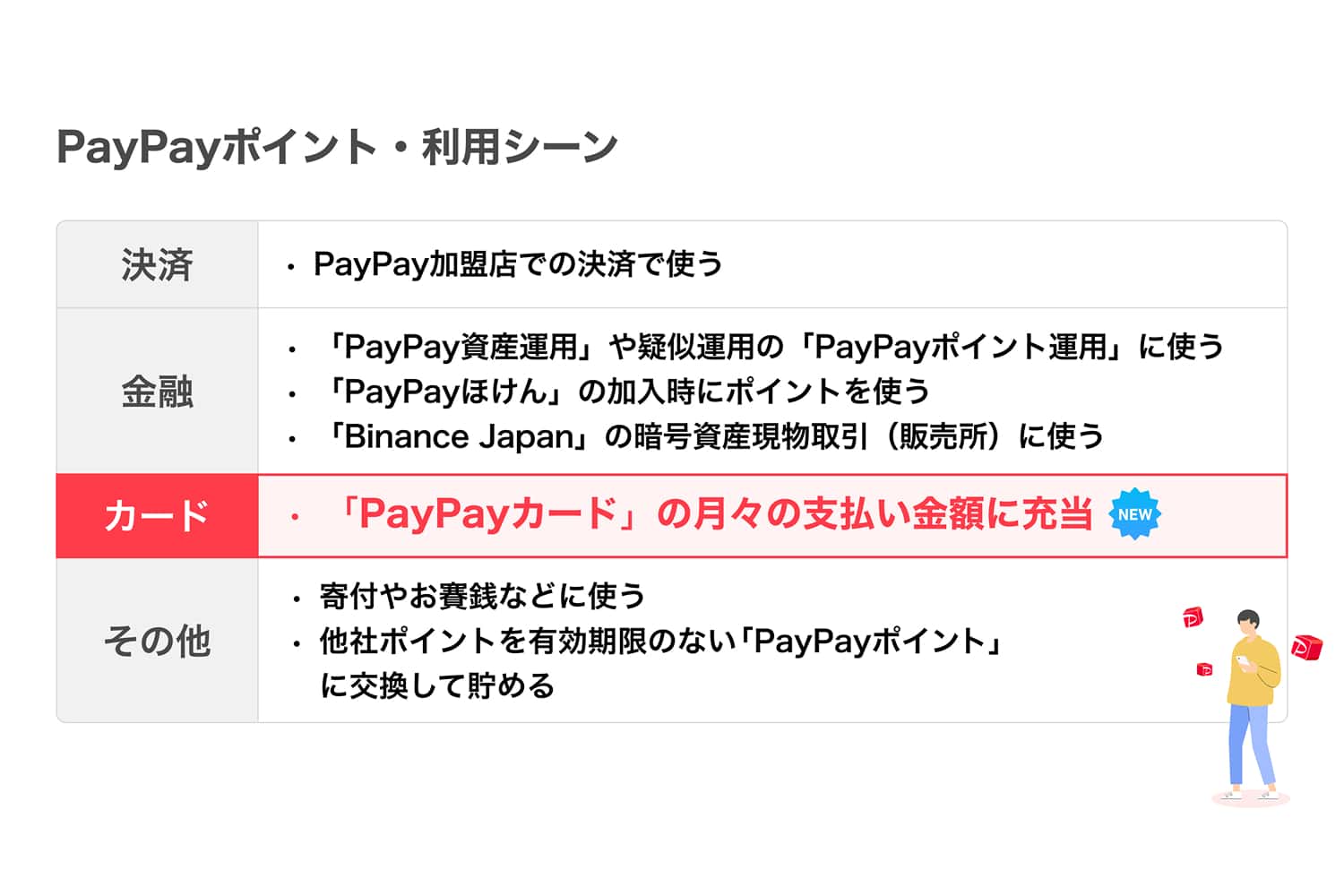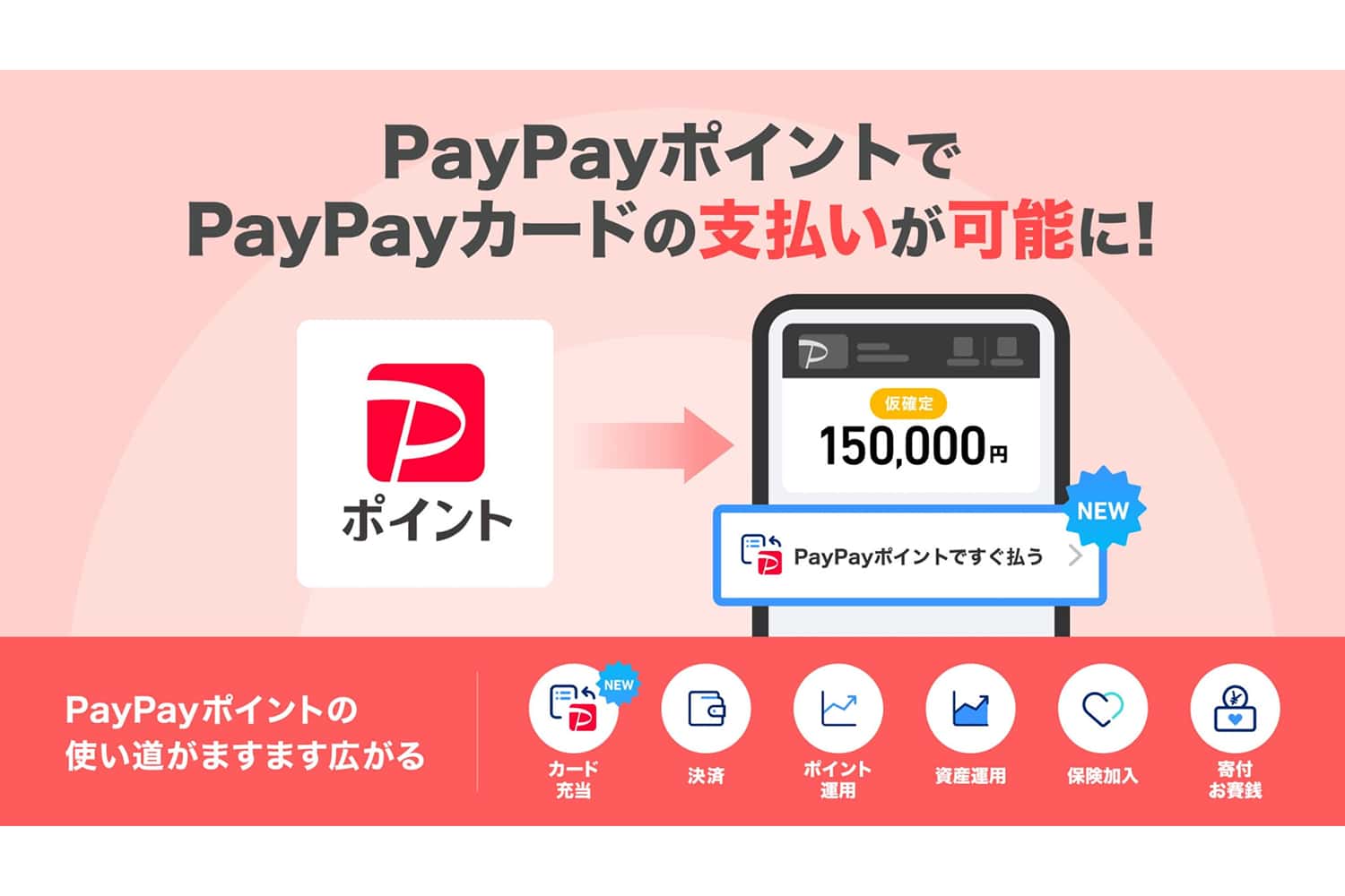 これにより、「PayPayポイント」はこれまでのPayPay加盟店での支払いやポイント運用、資産運用、保険などの金融サービスに加え、カードの支払い金額にも利用できるようになり、さらに使いやすいポイントに進化します。