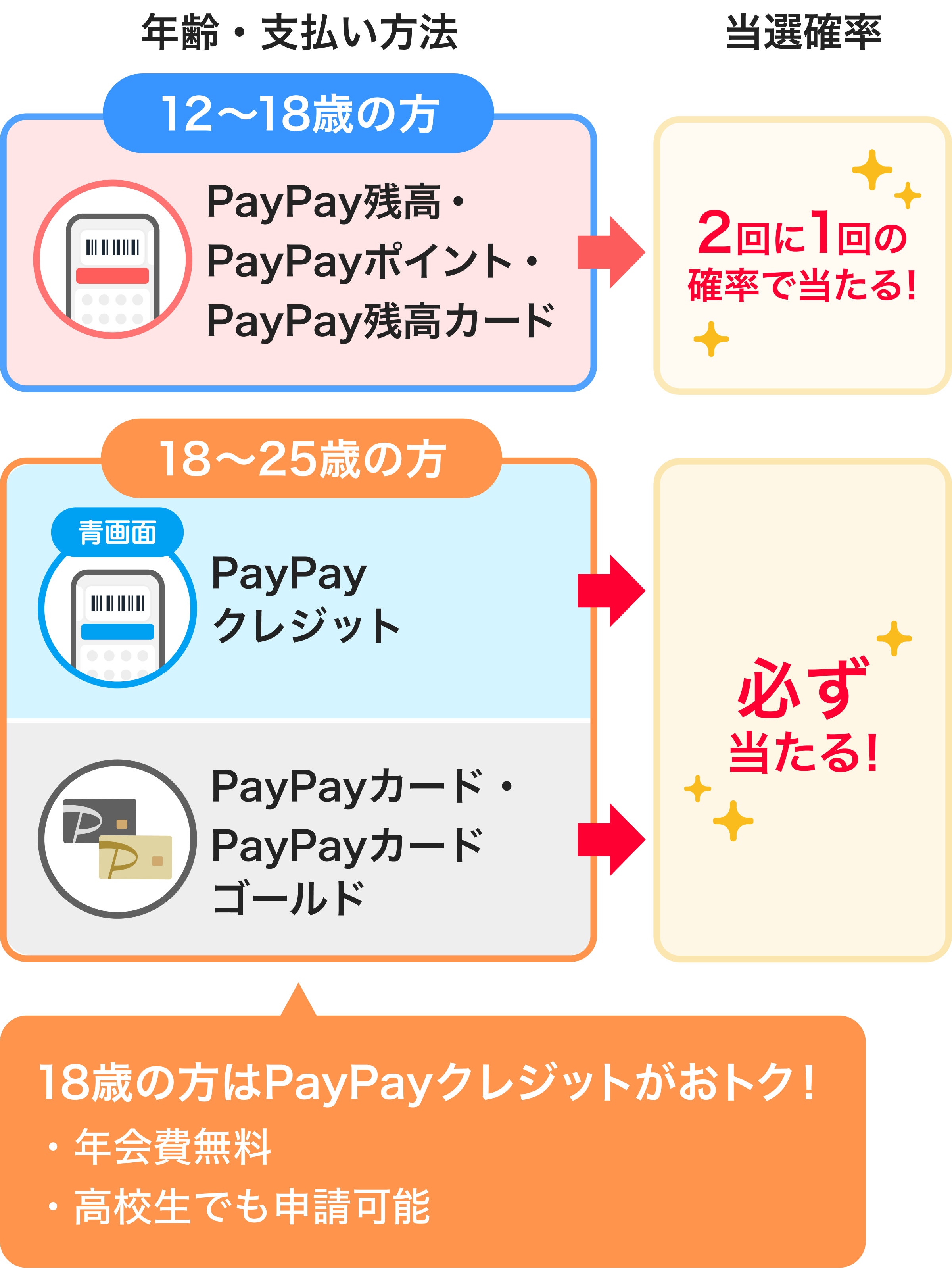 若い世代の優遇施策としては、12歳から18歳のユーザーは赤の画面「PayPay残高」での決済で1等から3等の当選確率が2回に1回にアップします。また、18歳から25歳のユーザーは青の画面「PayPayクレジット」あるいは「PayPayカード ゴールド」を含む「PayPayカード(プラスチックカード)」での決済により、1等から3等いずれかが必ず当たります(※10)。詳細は、こちらでご確認ください。